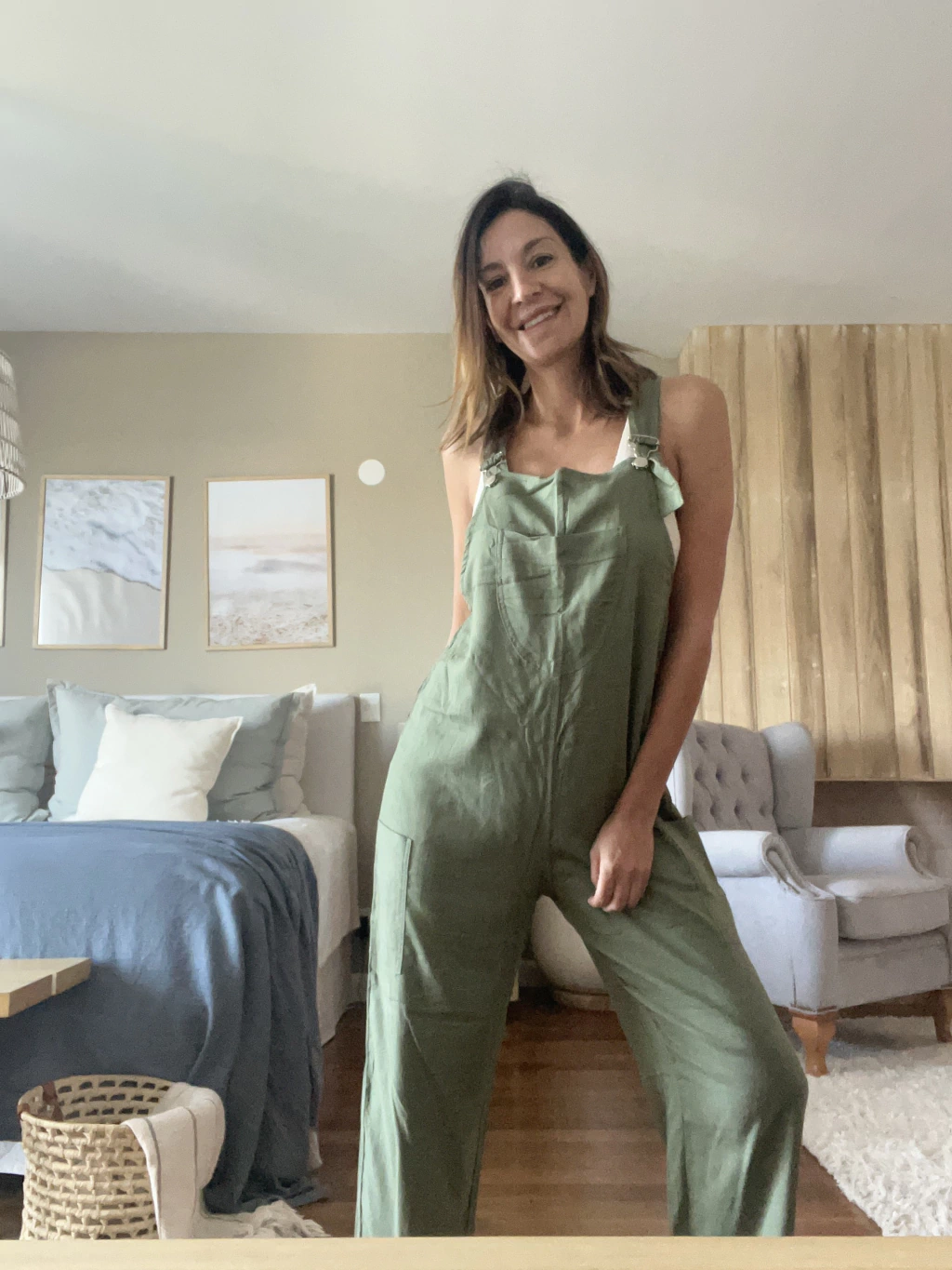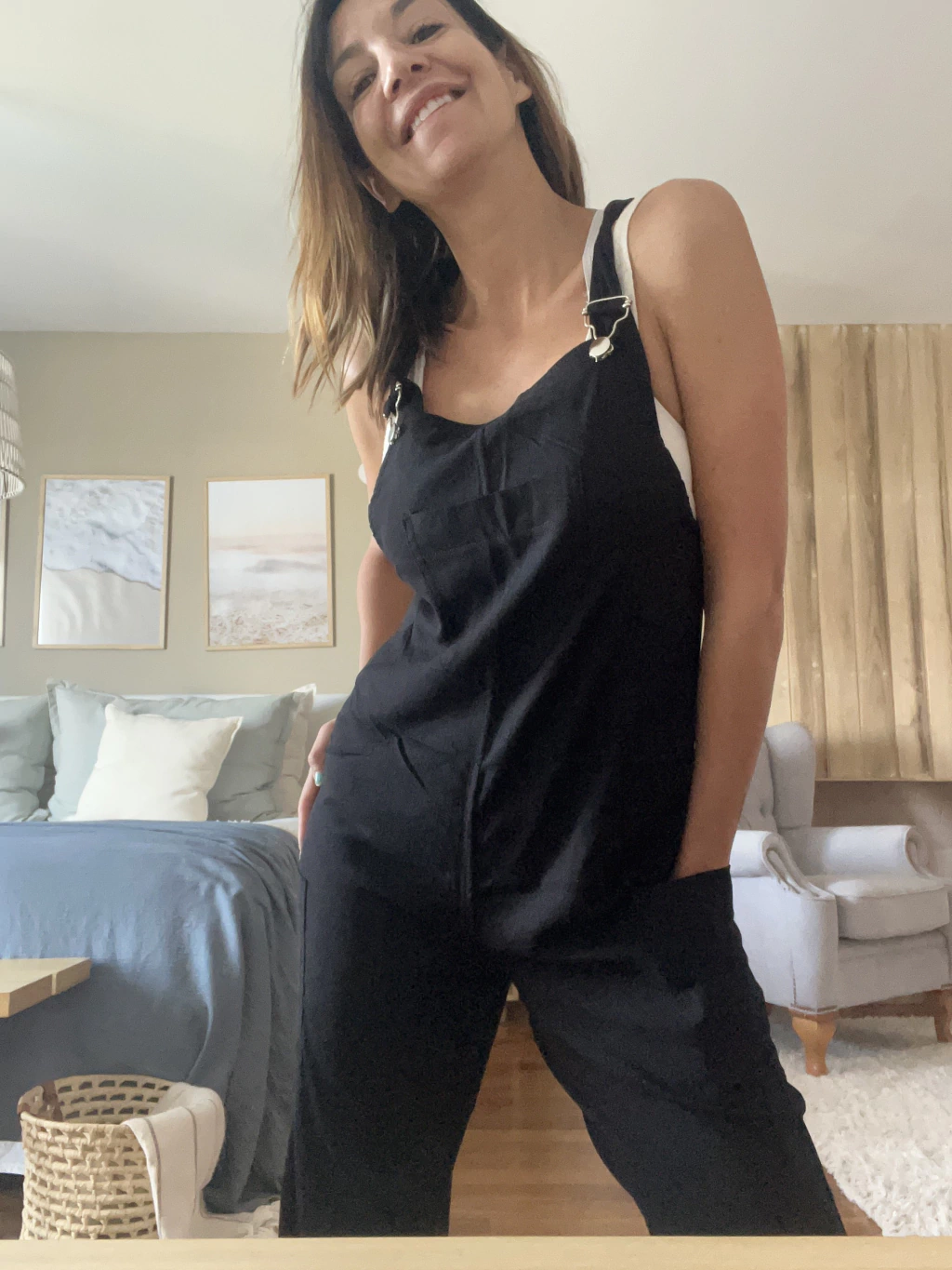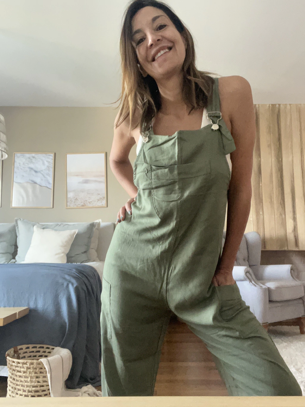 Mono de Lino, bolsillos delanteros, breteles con broches, piernas rectas, capri, muy fresco.